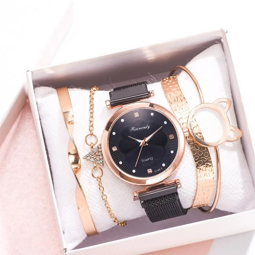 Fashion 5pcs Set Women Watches Luxury Magnet Buckle Flower Rhinestone Watch Ladies Quartz Wrist Watch Bracelet Set Reloj Mujer